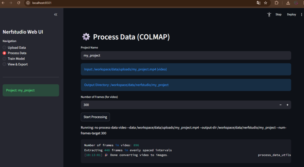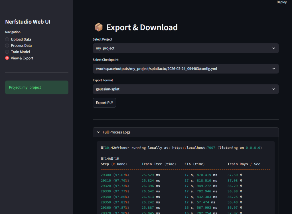 プロンプト: 「Web UIを作成し、写真や動画をアップロードしたらワンクリックで変換処理、トレーニング、.plyエクスポートができるようにしてください。」